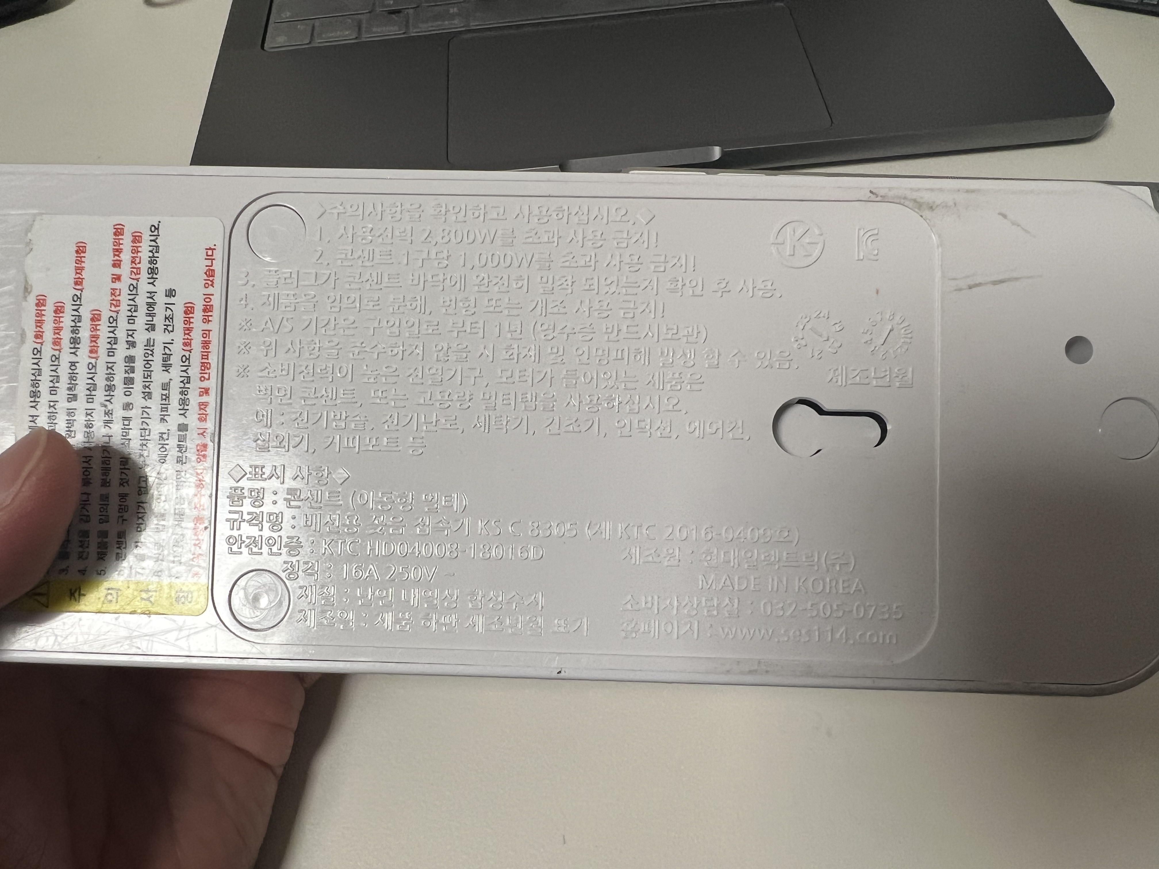 멀티탭 뒷면을 뒤집어 보면 깨알 같은 글씨가 써져 있습니다. 여기서 가장 중요한 건 [정격: 16A 250V] 같은 숫자입니다. 다이소나 마트에서 싸게 산 얇은 멀티탭은 보통 10A(암페어)인 경우가 많은데, 여기에 2000W가 넘는 전열기구를 꽂으면 허용 용량을 초과해버립니다. 멀티탭이 뜨끈뜨끈해지다가 '퍽' 소리와 함께 터지거나 불이 붙습니다. 전열기구를 쓴다면 반드시 '고용량 멀티탭(16A 이상, 4000W급)'이나 '벽면 콘센트'에 직접 꽂아야 안전합니다.