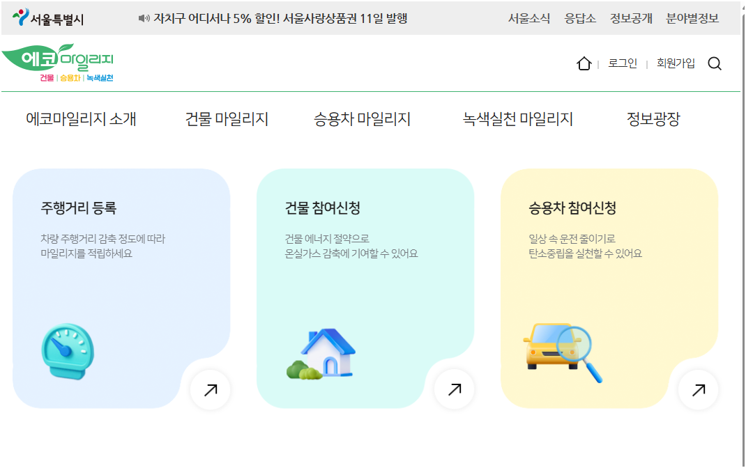 서울시 승용차 마일리지 신청 공식 사이트 화면