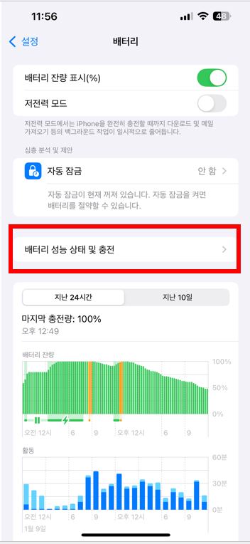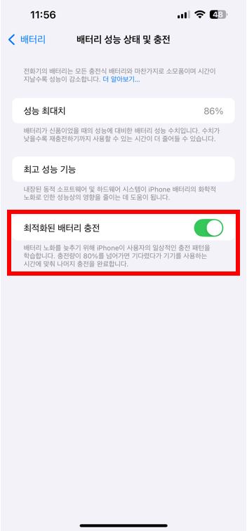설정에서 배터리에 들어갑니다. 화면 중단에 '배터리 성능 상태 및 충전'을 누르면 아래와 같은 화면이 뜨는데, 단추를 클릭하여 녹색으로 변경해주면 됩니다.