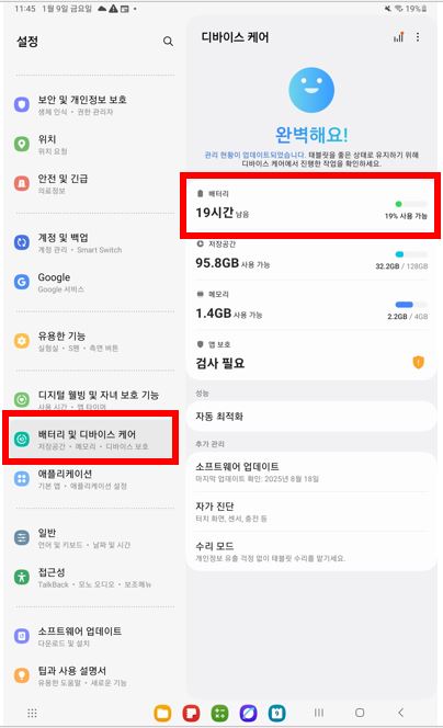 먼저 '설정'으로 들어가서 '배터리 및 디바이스 케어'를 누릅니다. (갤럭시 탭 기준) 우측의 '배터리'를 누르고, 나오는 화면에서 '배터리 보호'라고 되어 있는 곳의 단추를 터치하여 녹색으로 변경하면 완료됩니다. 버전이 다르기에 85%까지의 여유를 두고 있습니다.