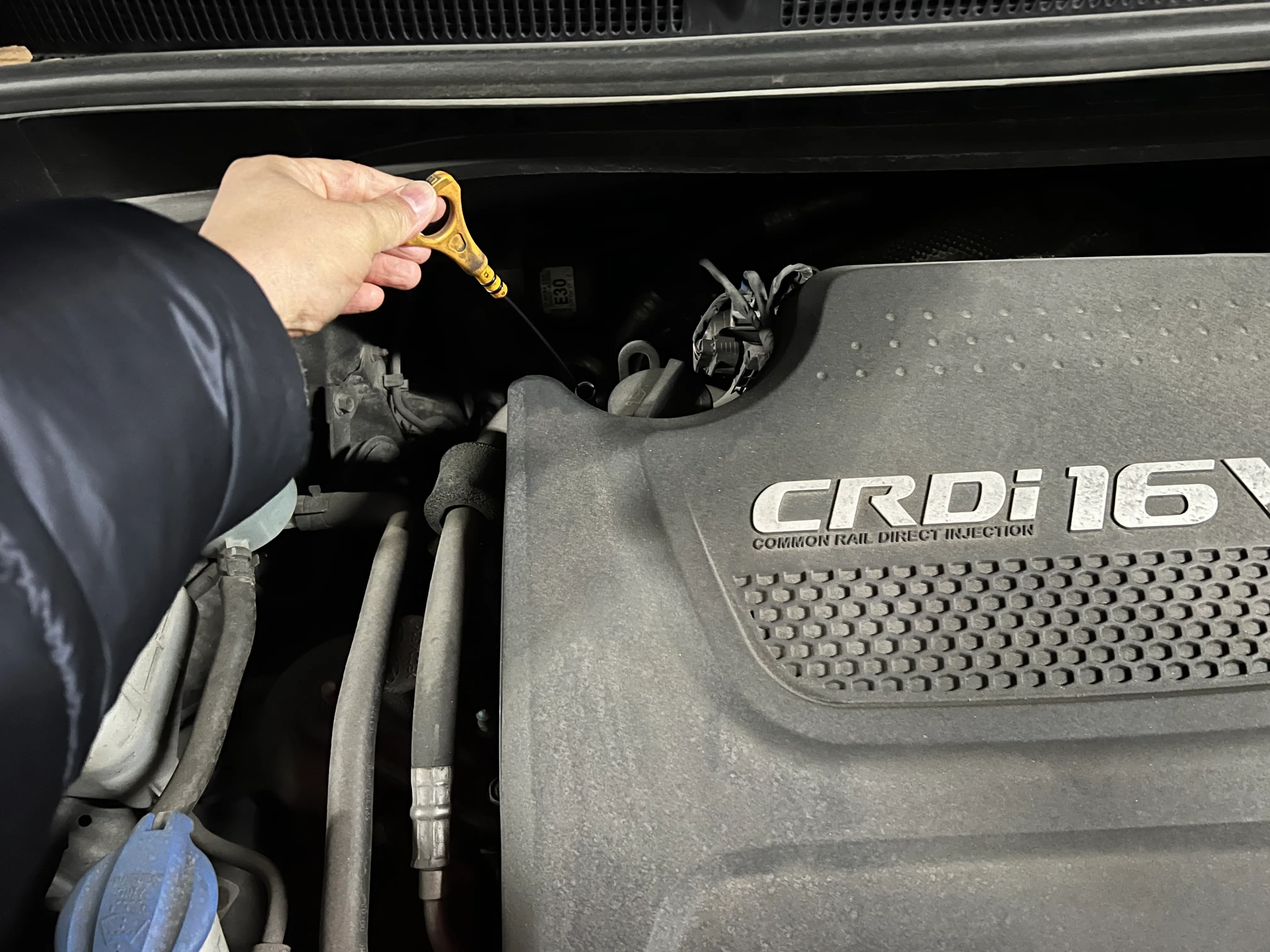 보닛을 열고 노란색 손잡이(딥스틱)를 뽑아보세요. 딥스틱을 닦고 다시 넣었다 뺐을 때 오일이 'L(Low)' 밑으로 내려가 있다면 보충이 필요합니다. 또한 묻어나온 오일을 엄지와 검지로 문질러보세요. 끈적한 느낌 없이 맹물처럼 주르륵 흐르고 마찰력이 느껴지지 않는다면 그때가 진짜 수명이 다한 교체 타이밍입니다.