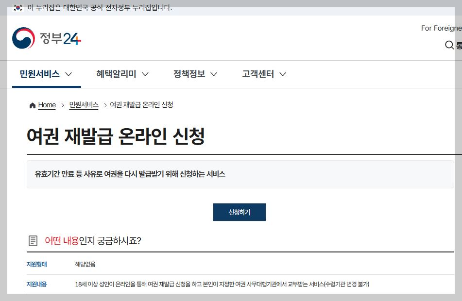 정부24에서 '온라인 여권 재발급'을 검색하면 나오는 화면