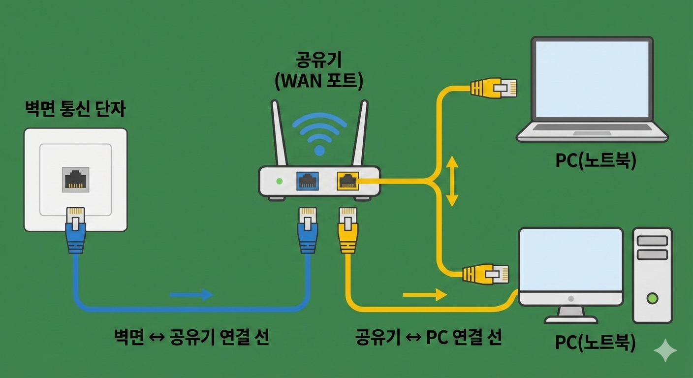 벽면(통신 단자)에서 공유기로 연결된 선과 공유기에서 PC 또는 노트북으로 연결된 선, 이 두 구간의 선을 모두 확인해야 합니다. 벽에서 공유기로 들어오는 선은 최신형인데, 공유기에서 내 컴퓨터로 꽂는 선이 구형(CAT.5)이라면 인터넷은 여전히 느립니다. 두 구간 모두 CAT.6 등급 이상으로 통일해주셔야 제 속도가 나옵니다.