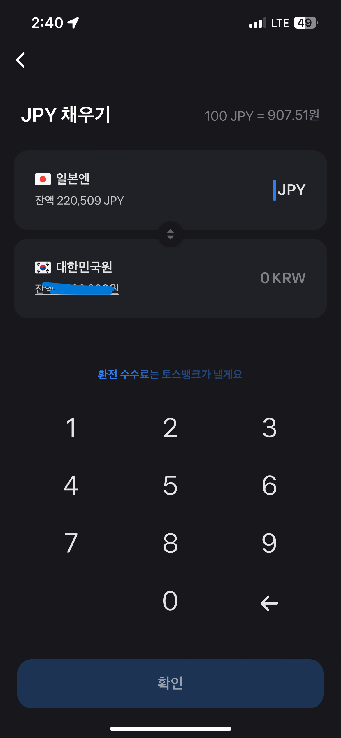필요한 만큼 대한민국원(사진 우)을 입력해주고, 확인 누르면